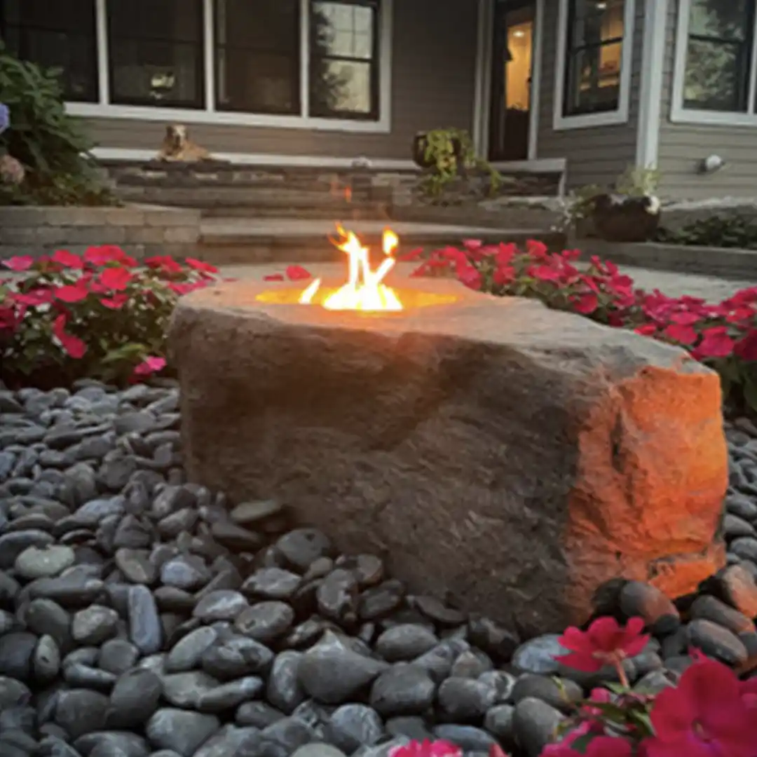 Boulder fire and water features from Garden Path Stone Center create stunning focal points that blend natural beauty with outdoor comfort.
