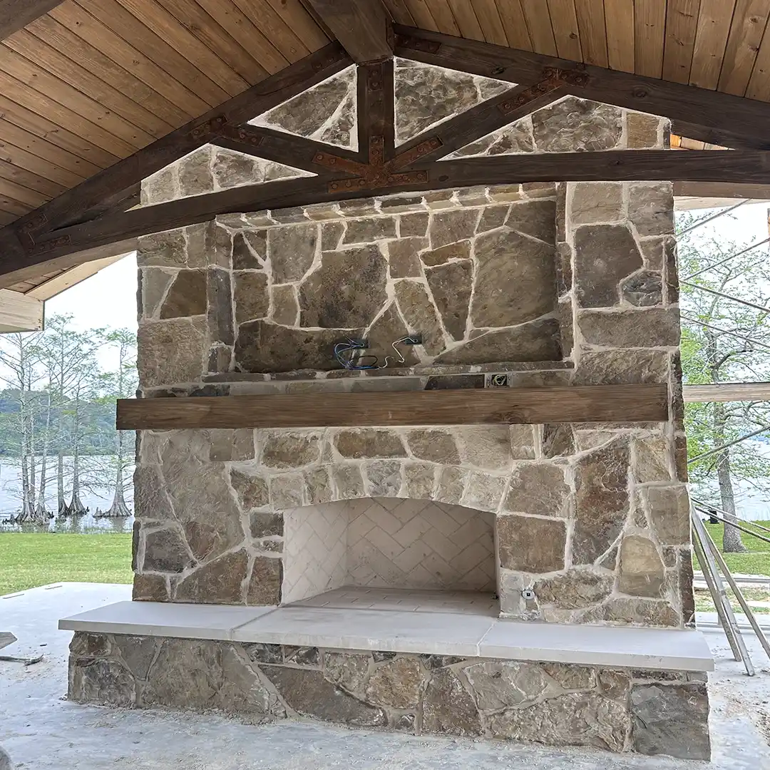 Fireplace hearths and mantels from Garden Path Stone Center add timeless charm and functionality to both indoor and outdoor fireplaces.